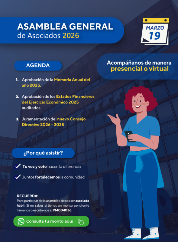 Invitamos a todos los asociados hábiles a participar de la Asamblea General Ordinaria de Asociados, convocada por el presidente del Consejo Directivo de la Asociación de Egresados y Graduados de la Pontificia Universidad Católica del Perú, de conformidad con lo establecido en la Ley 31194 y los artículos 10°, 11° acápites d), e) y j) y 23° acápite b) del Estatuto vigente de la Asociación, cita para el día jueves 19 de marzo del 2026 a la Asamblea General Ordinaria de Asociados, para tratar la siguiente agenda: